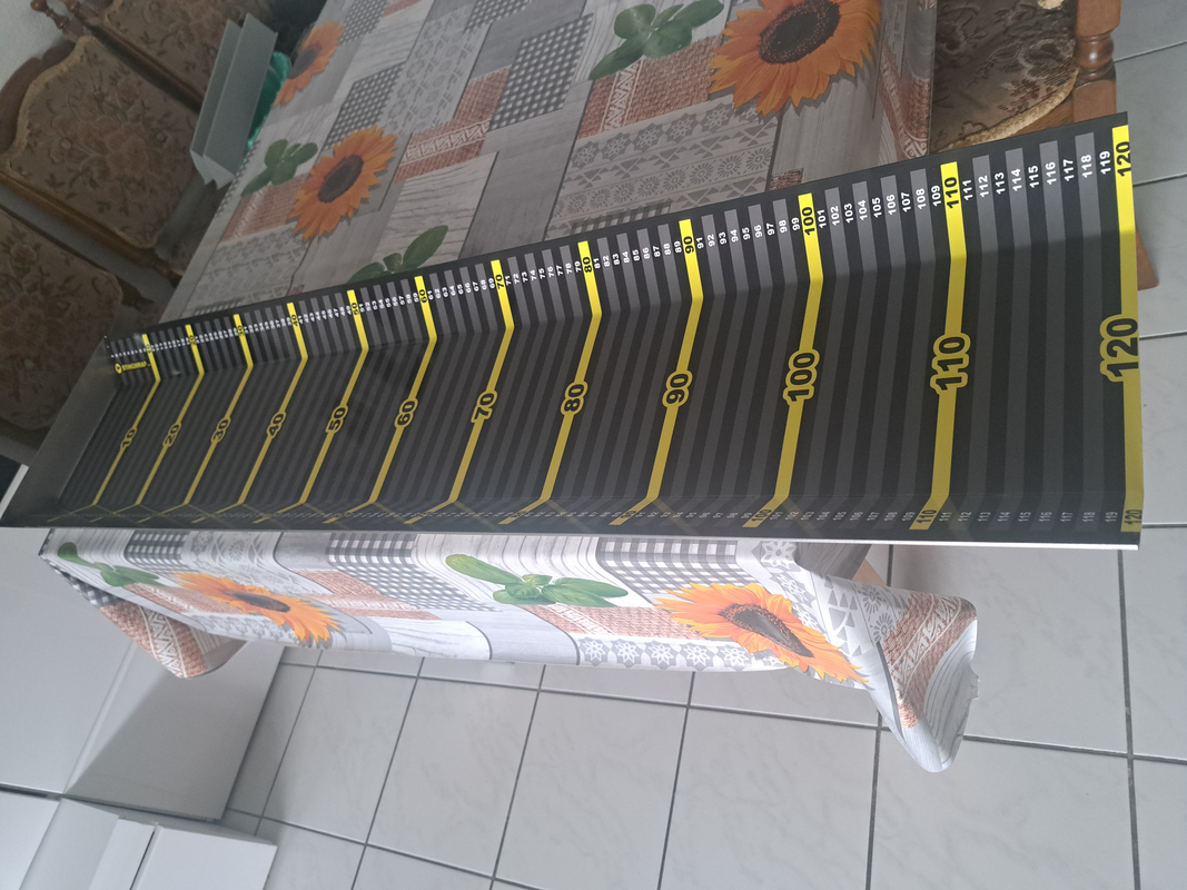 Je suis très satisfaite de l'autocollant pour ruban à mesurer, fabriqué après une courte conversation téléphonique sur 120cm x32.5cm, facile à appliquer sur un bac de mesure en acier inoxydable.
